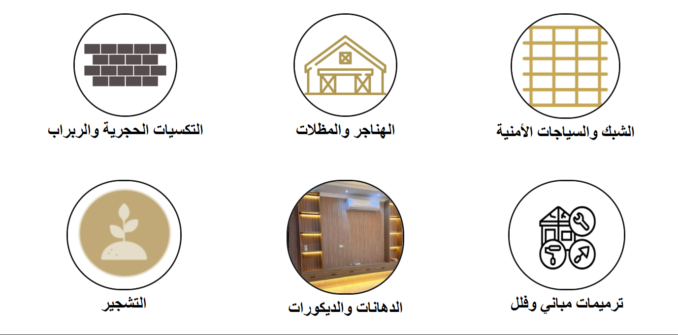 تنسيق المواقع، تركيب الأسوار، تنفيذ الممرات، تحسين المساحات الخارجية، وتركيب مظلات وهياكل إضافية حسب متطلبات العميل.
